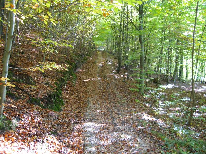 Po tym odcinku przyszła pora na troche asfaltu - ok 1 km i ponownie w las. Słońce pięknie prześwietlało, przerzedzone już korony drzew, a pozostały "liściostan" podbarwiał powietrze o zółtości i czerwienie. Można by rzec - przyroda zachwyciła Andrzeja w drodze; "nasze tereny są o każdej porze śliczne, aż chce się jeździć". Trafiały się także spotkania z lokalną fauną - sarna między drzewami i kilka zajęcy śmigających po poboczu ścieżek. Zdarzyło przy innej okazji treningowej, że nasz rozmówca jechał na odcinku z góry, wchodził w zakręt przy skarpie, kiedy natknął się na stado młodych dziczków, jeszcze w pasiakach - pisk okrutny przestraszonych zwierzaków, nieopodal, wyżej poważne starszaki odwróciły głowy z chrapnięciem, nie było wyjścia - po mistrzowskim ominięciu warchlaków, noga mocniej na pedały i sprint. Po czasie przyszła refleksja; gdyby tak trafić w jednego to leżałby jak długi i nie wiadomo czy byłby w stanie dobiec do najbliższego drzewa. Jak na tacy dzikom do konsumpcji.